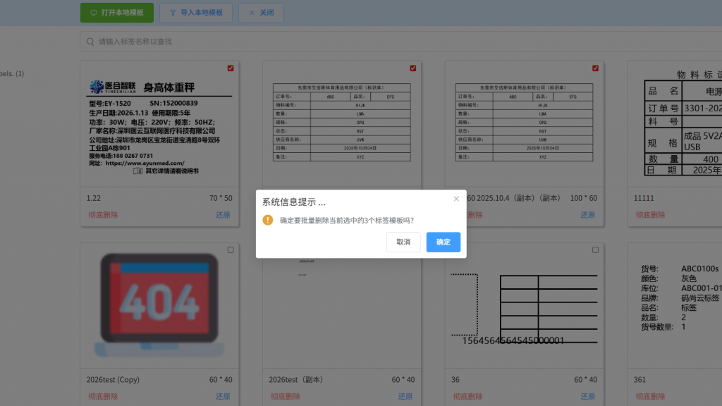 所有手动删除的标签模板、打印记录、自定义字段,会自动移入回收站,不会直接彻底清除,无需手动备份,避免因疏忽导致数据永久丢失。