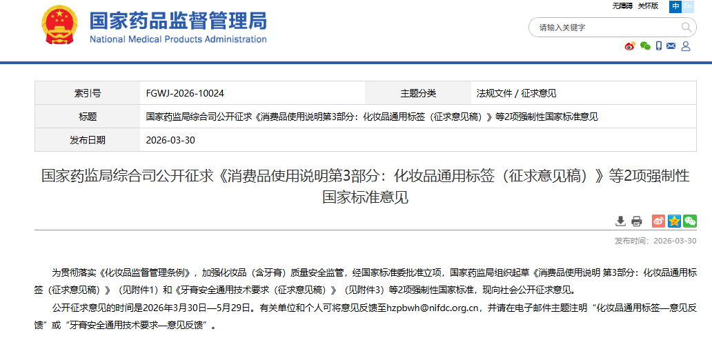 2026年3月30日,国家药监局发布《消费品使用说明 化妆品通用标签》强制性国家标准修订征求意见稿,公开征求意见至5月29日。征求意见稿首次在强制性国家标准层面增加了电子标签的相关内容,并对进口化妆品中文标签、小规格化妆品标注要求、儿童化妆品标注要求等进行汇总和规定。