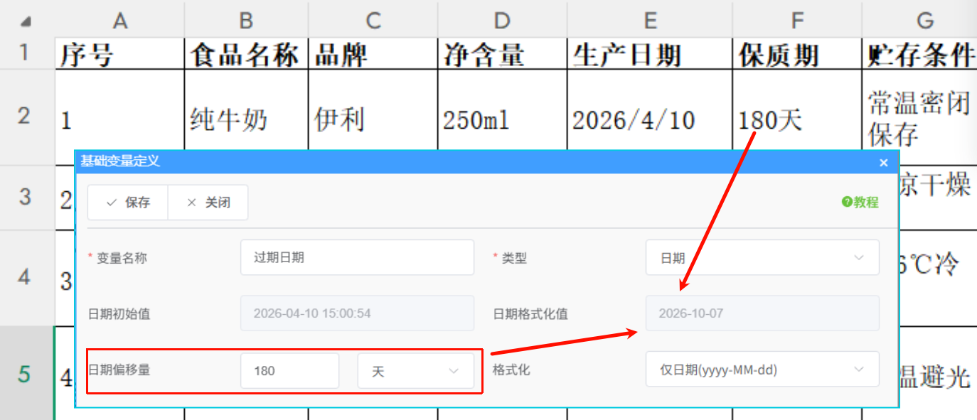 软件支持日期变量功能,用户可预设“yyyy-MM-dd”等格式模板。针对新规要求的保质期到期日标注,可通过添加“日期”变量,并利用其 “日期偏移量” 功能进行设置——例如填写“180天”,打印时该日期变量将在当前日期基础上自动增加180天,从而准确显示保质期到期日。打印时系统自动获取当前日期并完成偏移计算,减少人工推算环节。