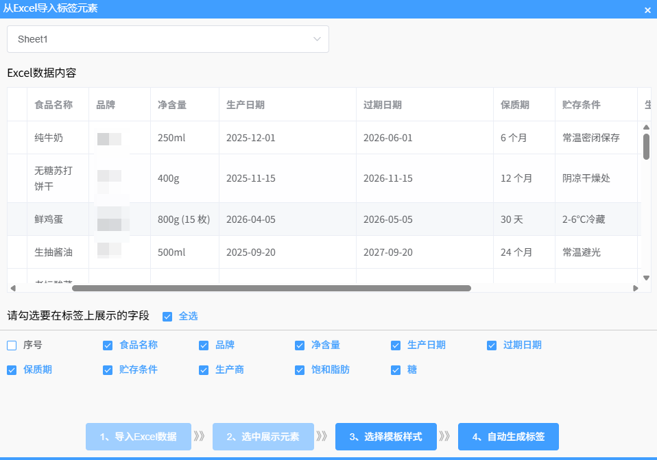 针对新增“饱和脂肪”和“糖”两项强制标示,企业可先在Excel表格中统一维护更新后的营养成分数据,再通过码尚云标签的数据导入功能一键生成对应标签。模板字段与Excel列绑定后,可实现数百个SKU标签的快速更新与预览打印。