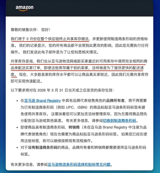 距离2026年3月31日亚马逊终止共享库存政策仅剩最后一周。根据亚马逊官方公告,新规将于3月31日起在全球六大站点(美国、加拿大、墨西哥、欧洲、澳大利亚、日本)同步生效。此次调整的核心变化在于:经销商(含授权经销商)无论商品是否已有制造商条形码(如UPC/EAN),均须为每件商品粘贴X00开头的亚马逊条形码(FNSKU)方可入库销售。