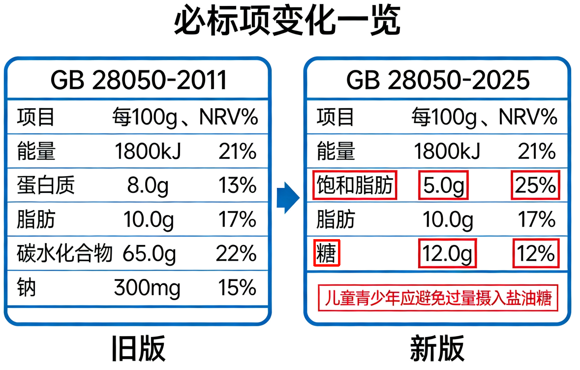 相较于2011版标准,GB 28050-2025在强制标示内容、营养计算、声称规范、豁免范围等方面做了多项关键更新,直接影响全国百万食品企业的标签设计。