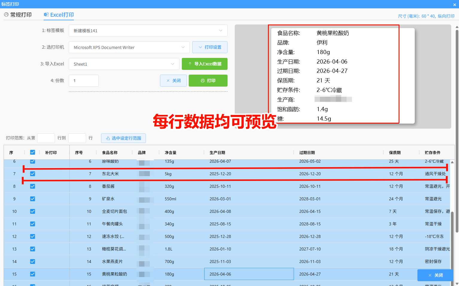 对于SKU数量较多的企业,可通过Excel批量导入功能处理:在Excel中整理各SKU的营养成分数据,包含产品名称、规格、能量、蛋白质、脂肪、饱和脂肪、碳水化合物、糖、钠等字段;将数据表导入软件,模板字段与Excel列绑定;预览确认后批量生成多SKU的营养标签,减少逐一手动录入的工作量。